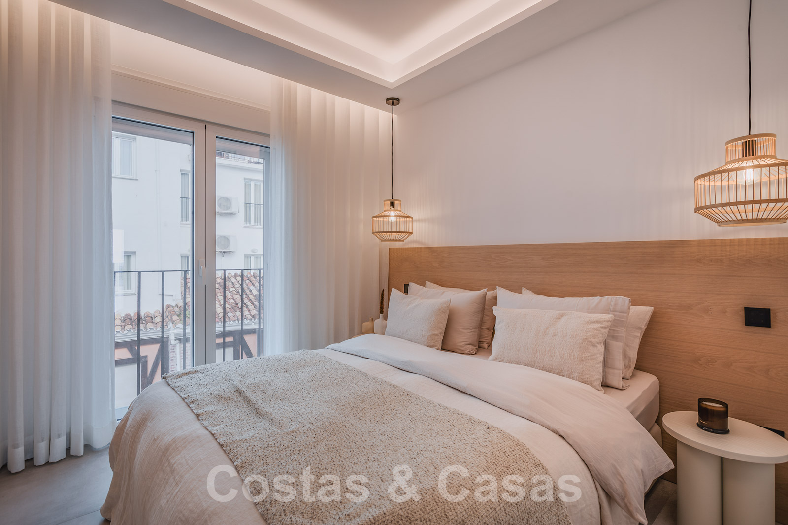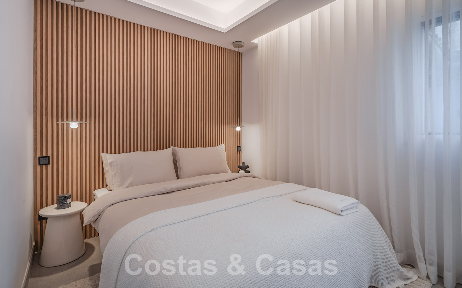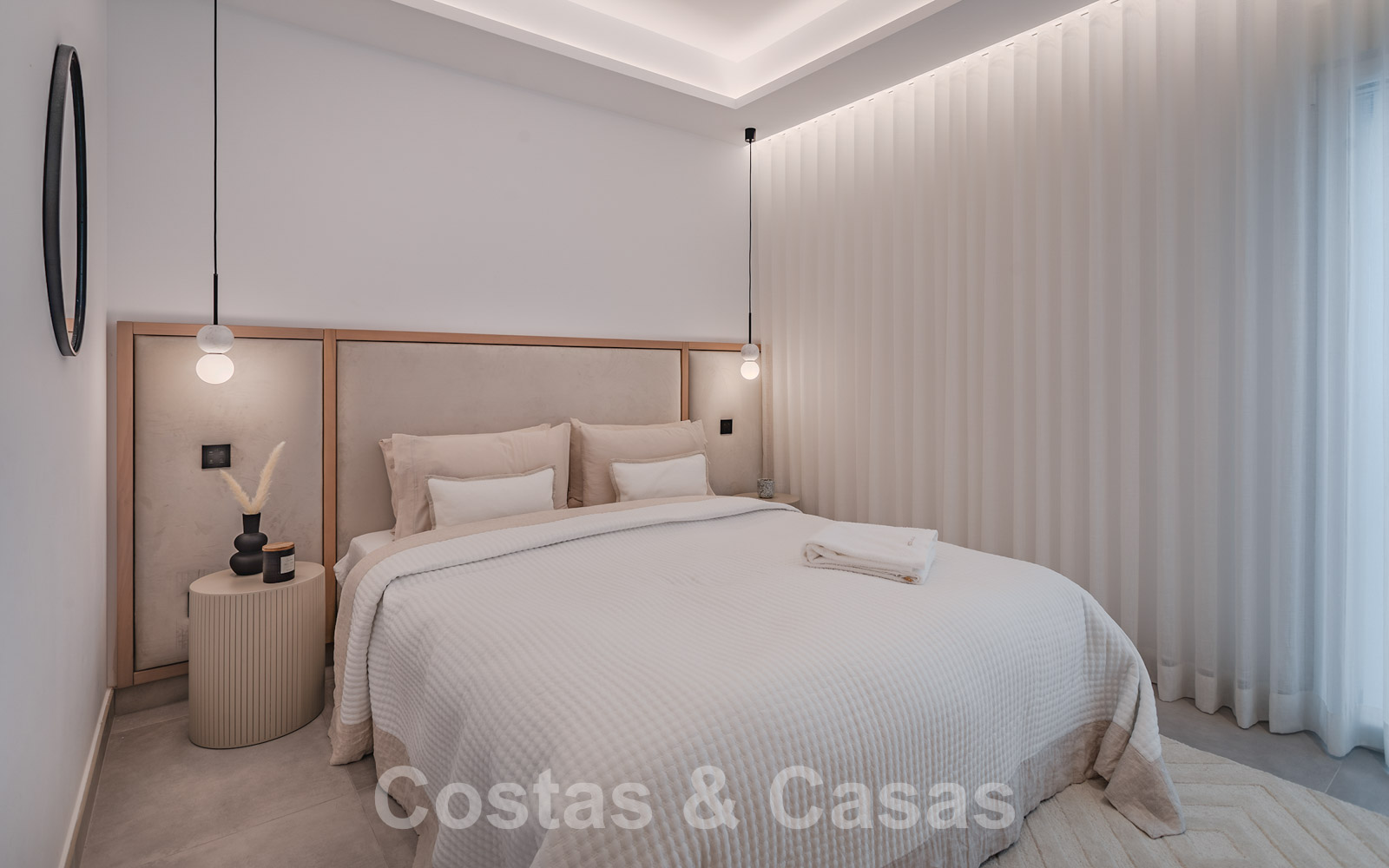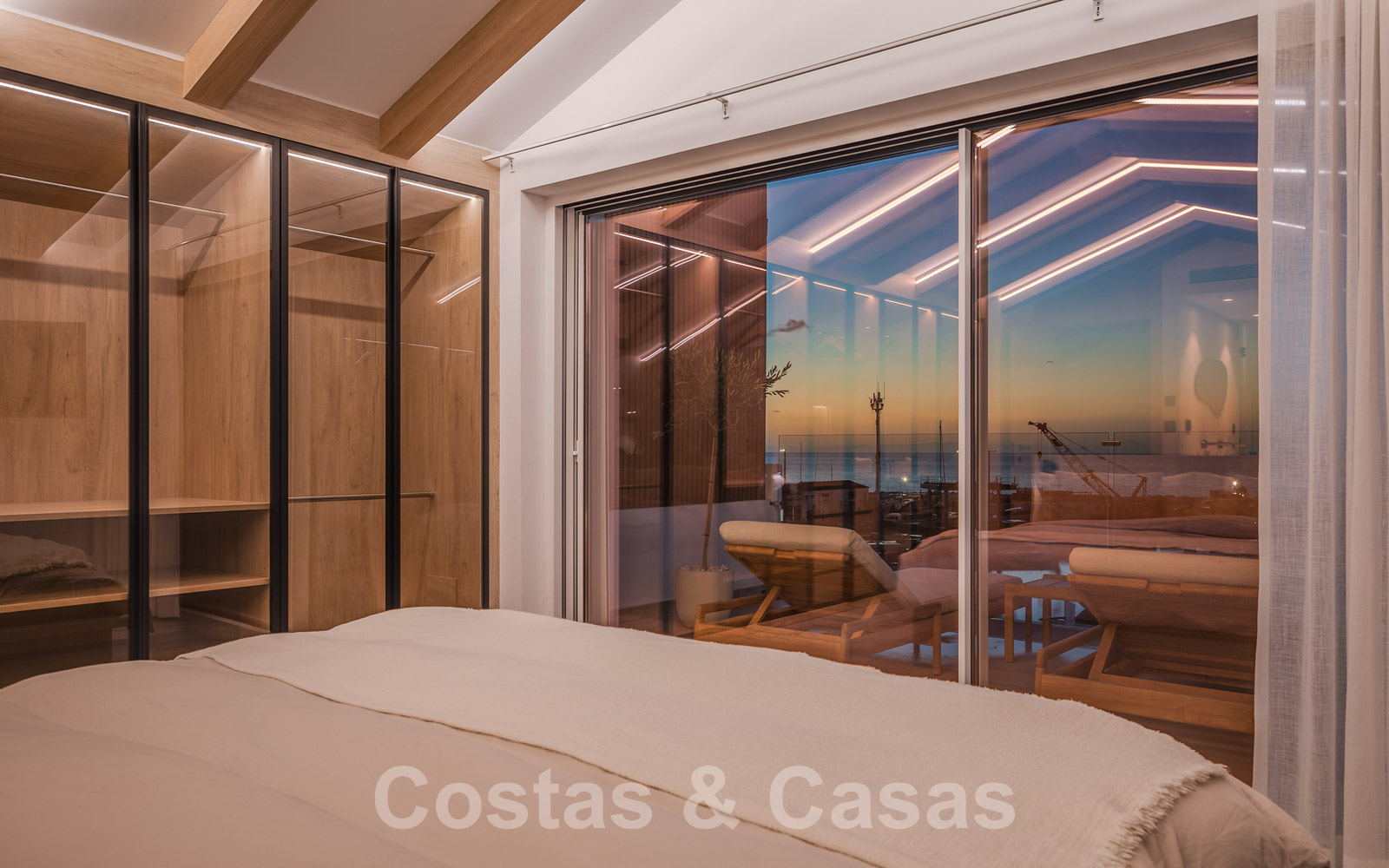 De elegante hoofdslaapkamer op de bovenverdieping geniet van een open badkamer en een naadloze overgang naar het privéterras.