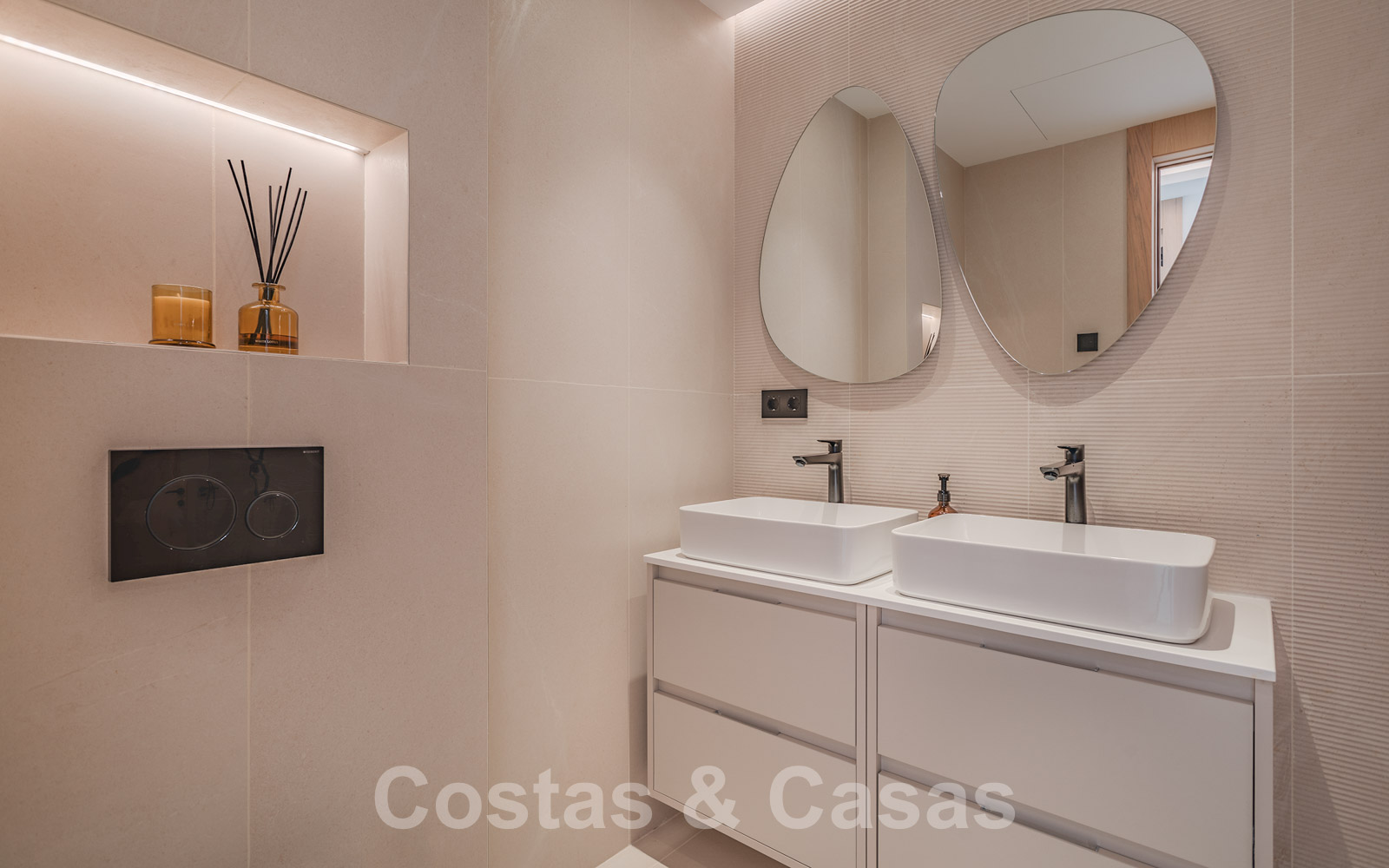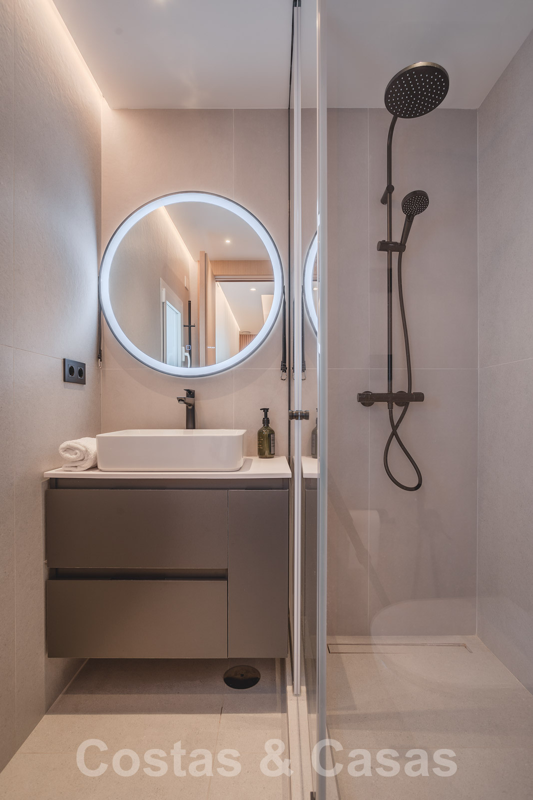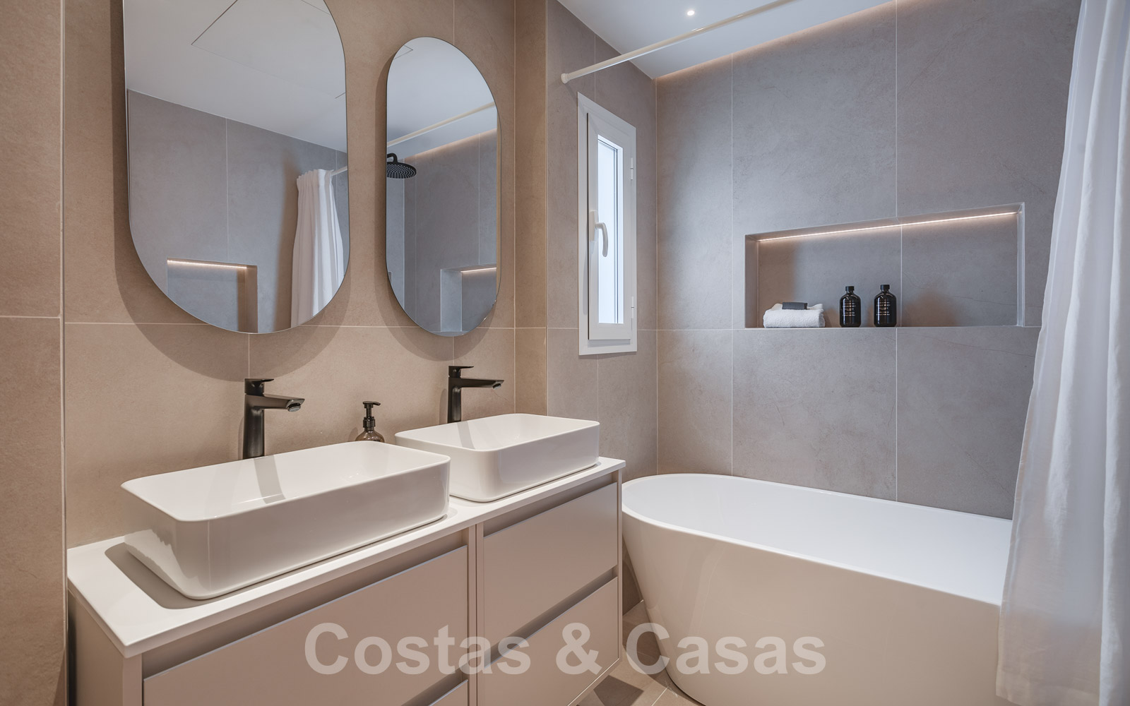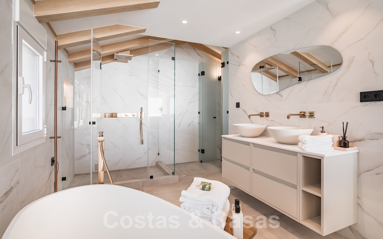 De elegante hoofdslaapkamer op de bovenverdieping geniet van een open badkamer en een naadloze overgang naar het privéterras.
