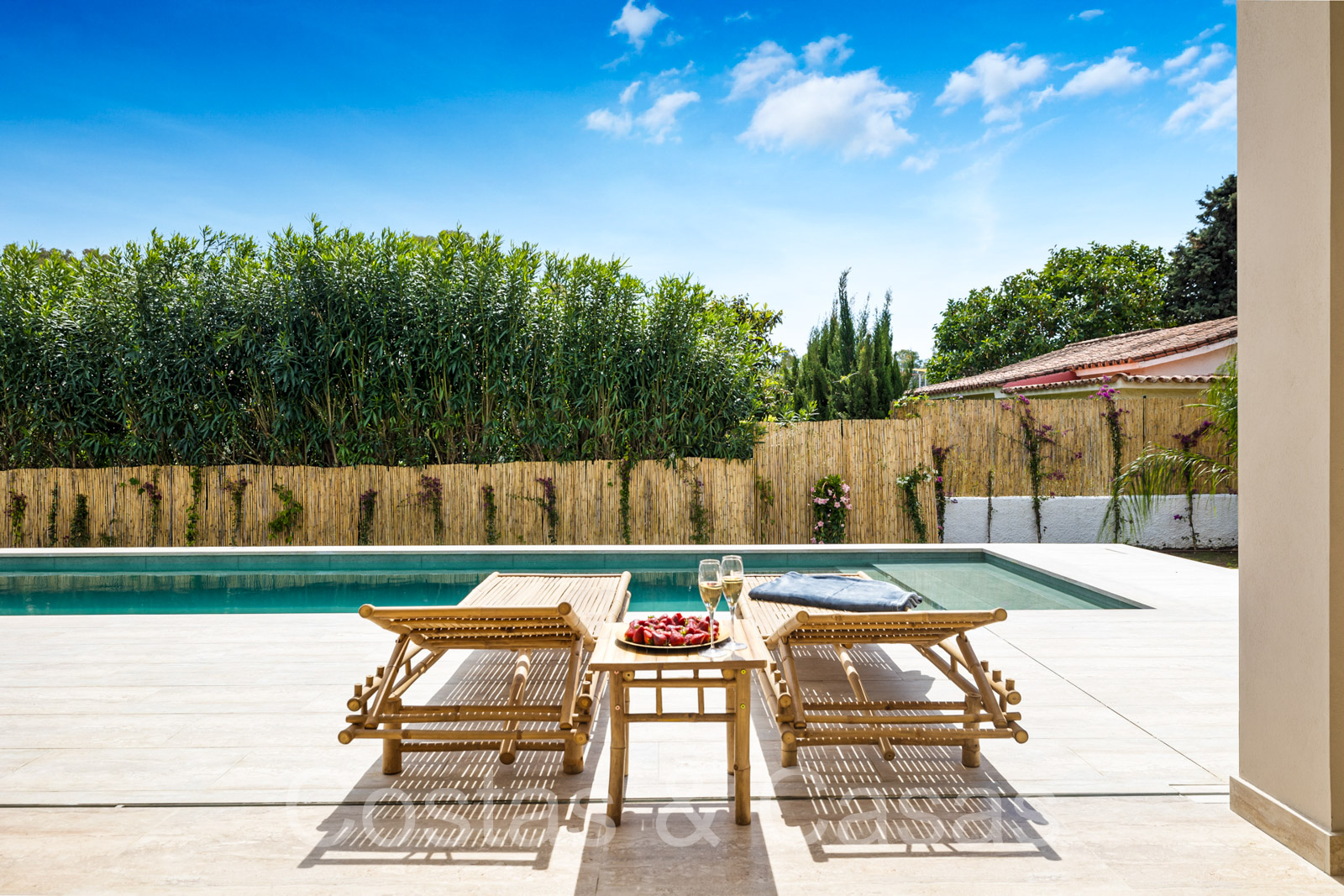 Verzorgd exterieur met ingebouwd privézwembad omgeven door een zonnedek.