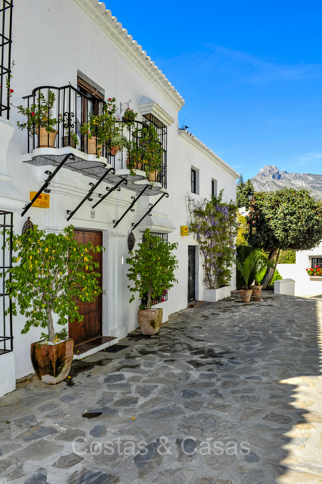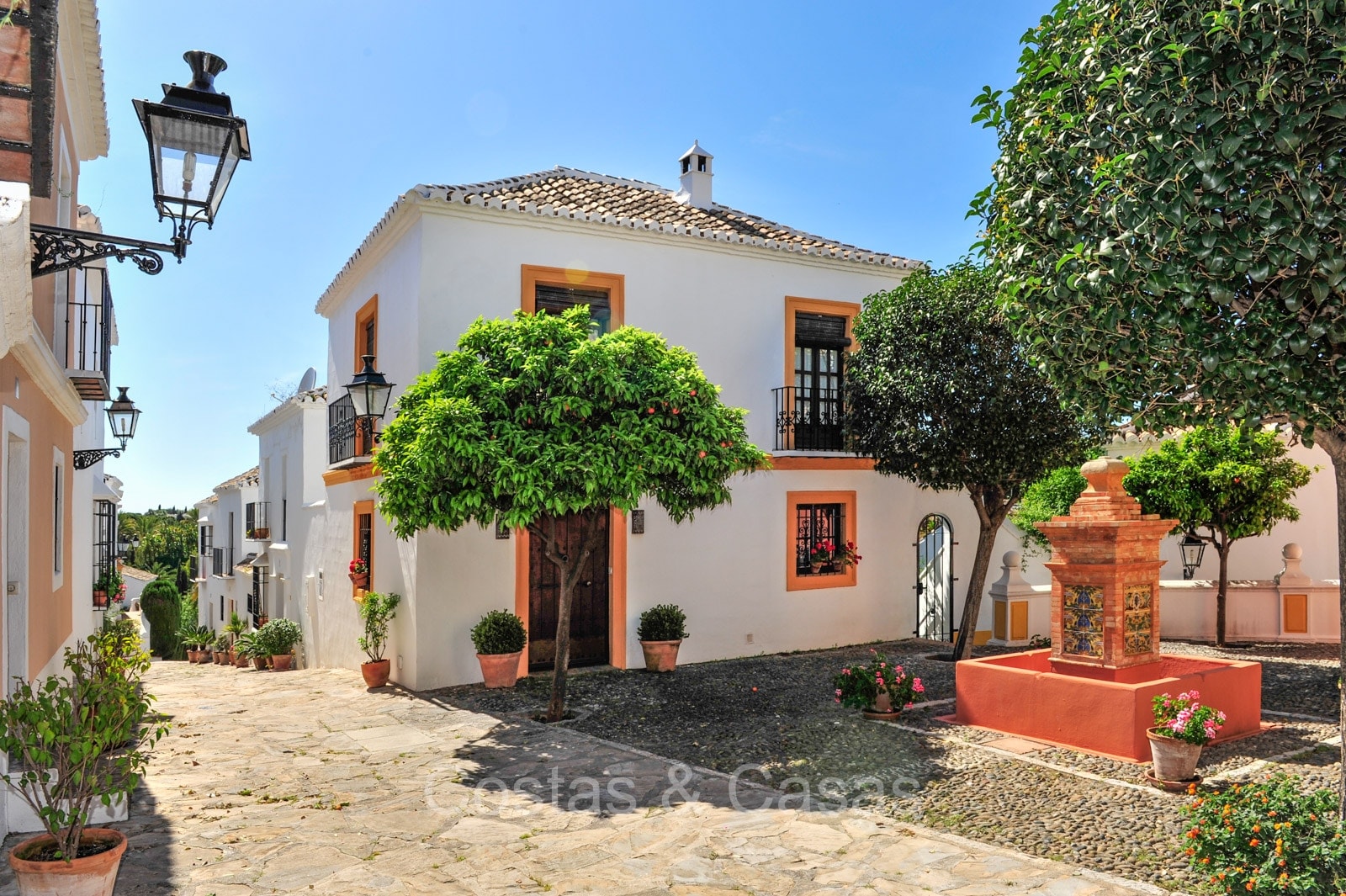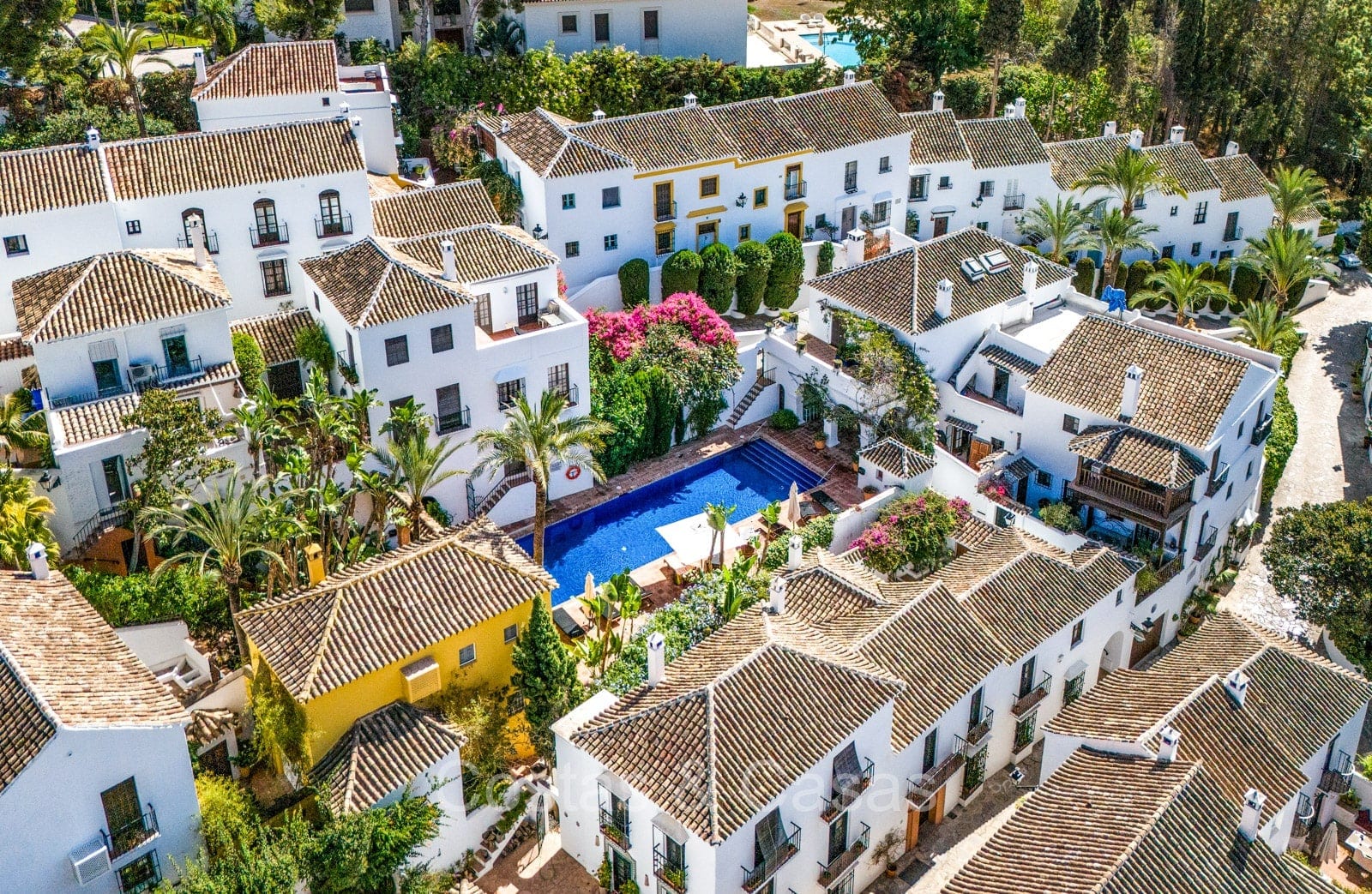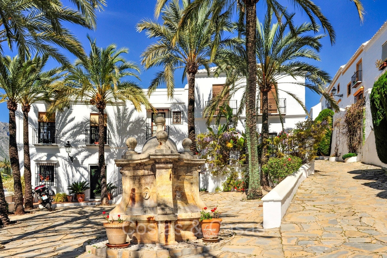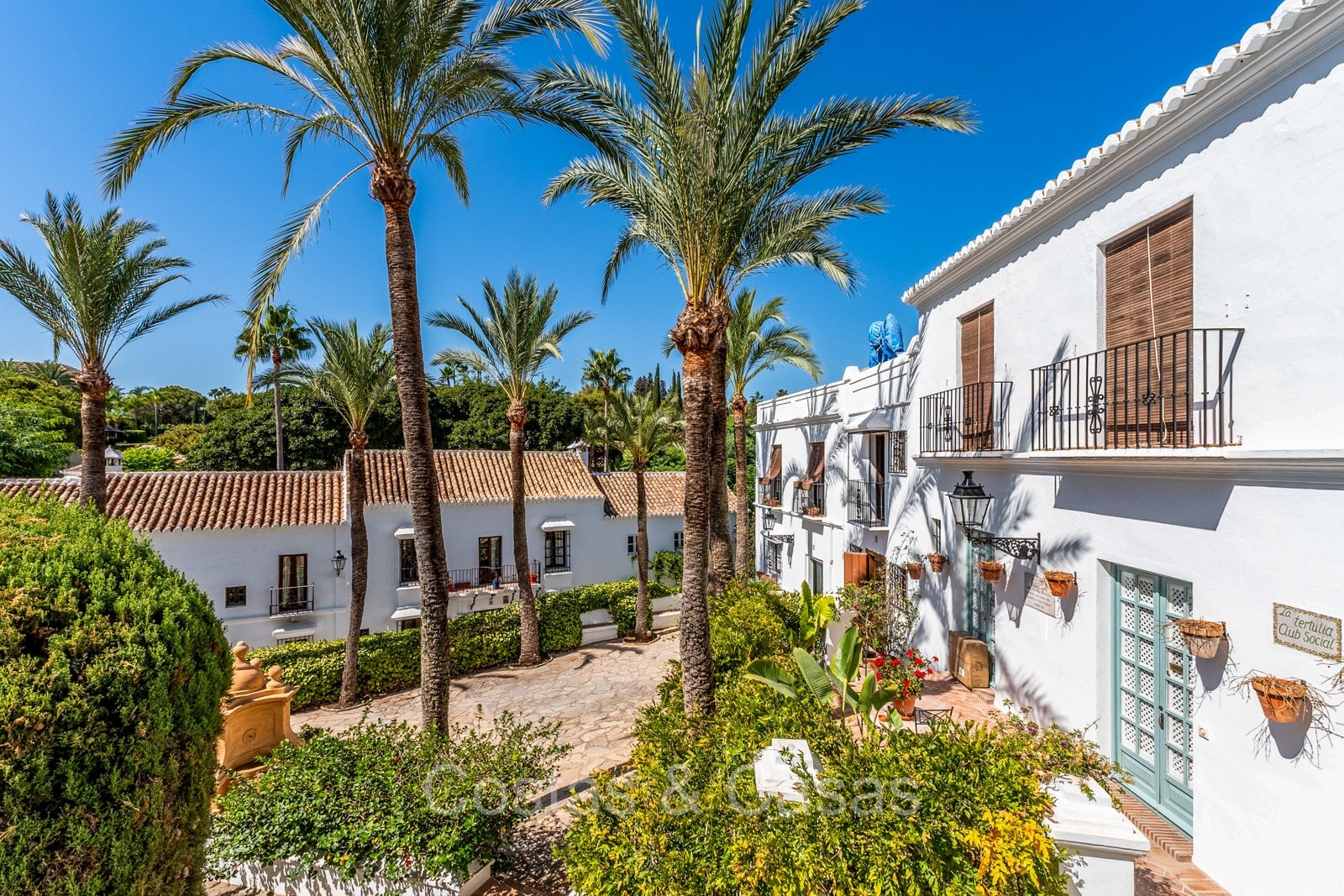 Het traditioneel ‘pueblo’-complex staat bekend om de witgekalkte huizen, smalle straatjes, sfeervolle pleintjes en zonnige terrassen, met karakteristieke betegelde gevels en sierlijke smeedijzeren balkonnetjes die de authentieke Andalusische charme uitstralen.