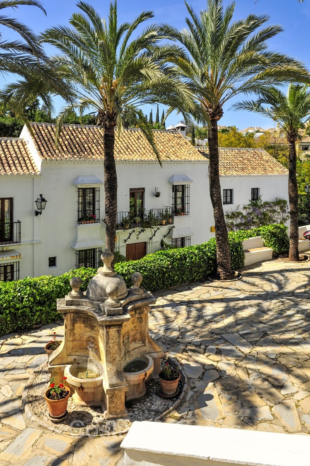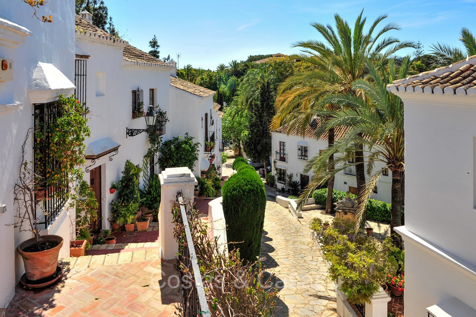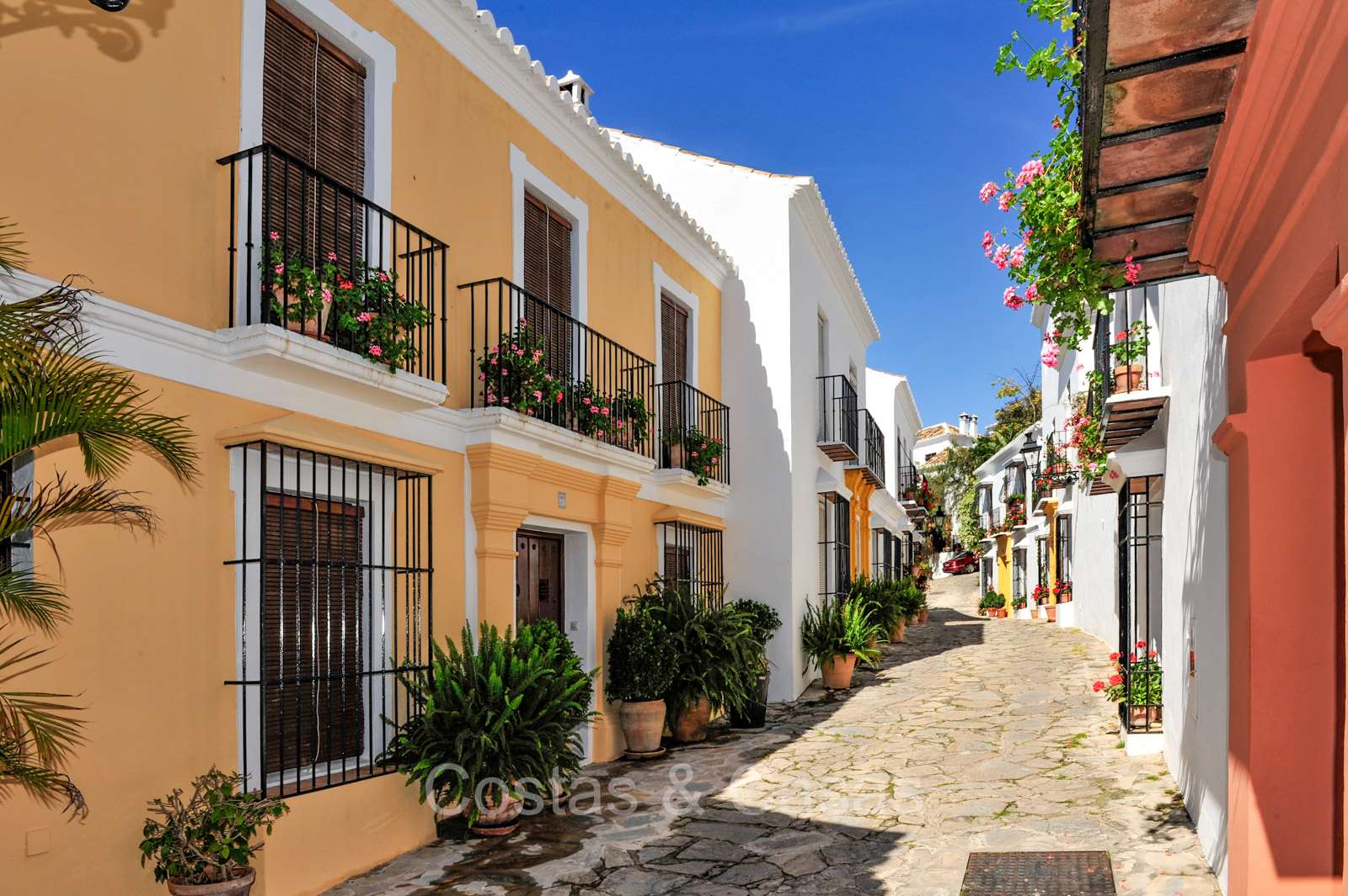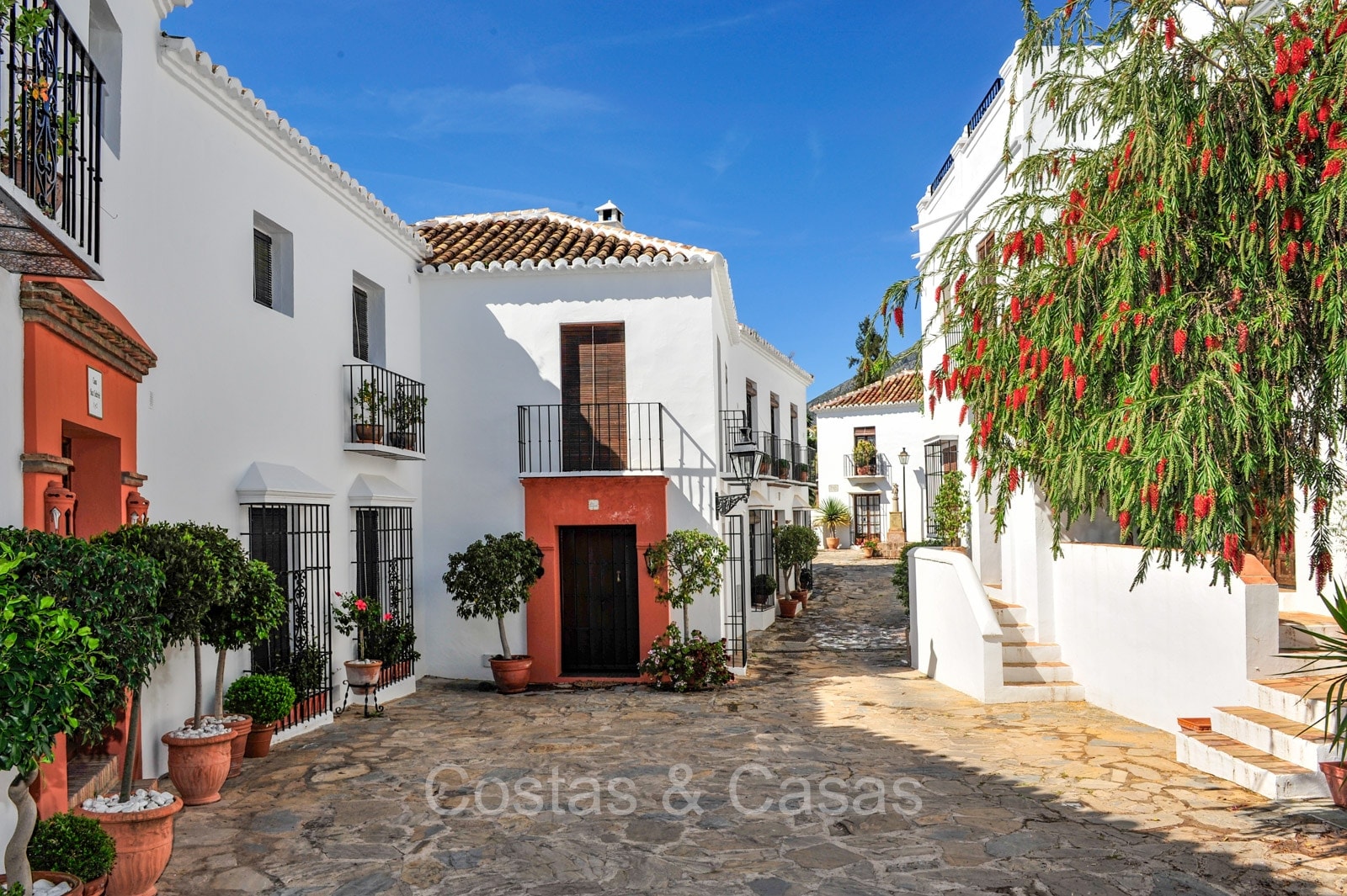 Het traditioneel ‘pueblo’-complex staat bekend om de witgekalkte huizen, smalle straatjes, sfeervolle pleintjes en zonnige terrassen, met karakteristieke betegelde gevels en sierlijke smeedijzeren balkonnetjes die de authentieke Andalusische charme uitstralen.