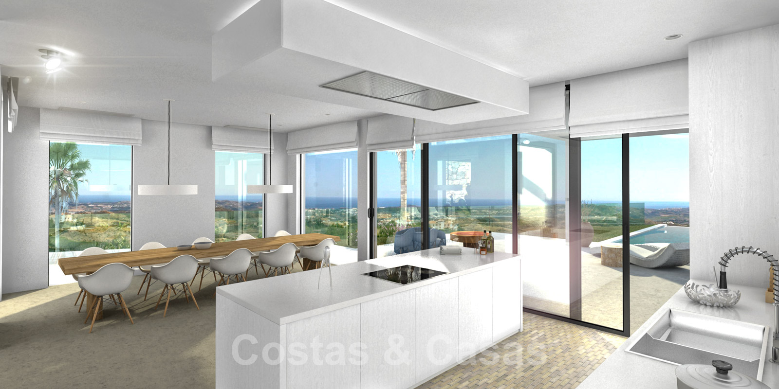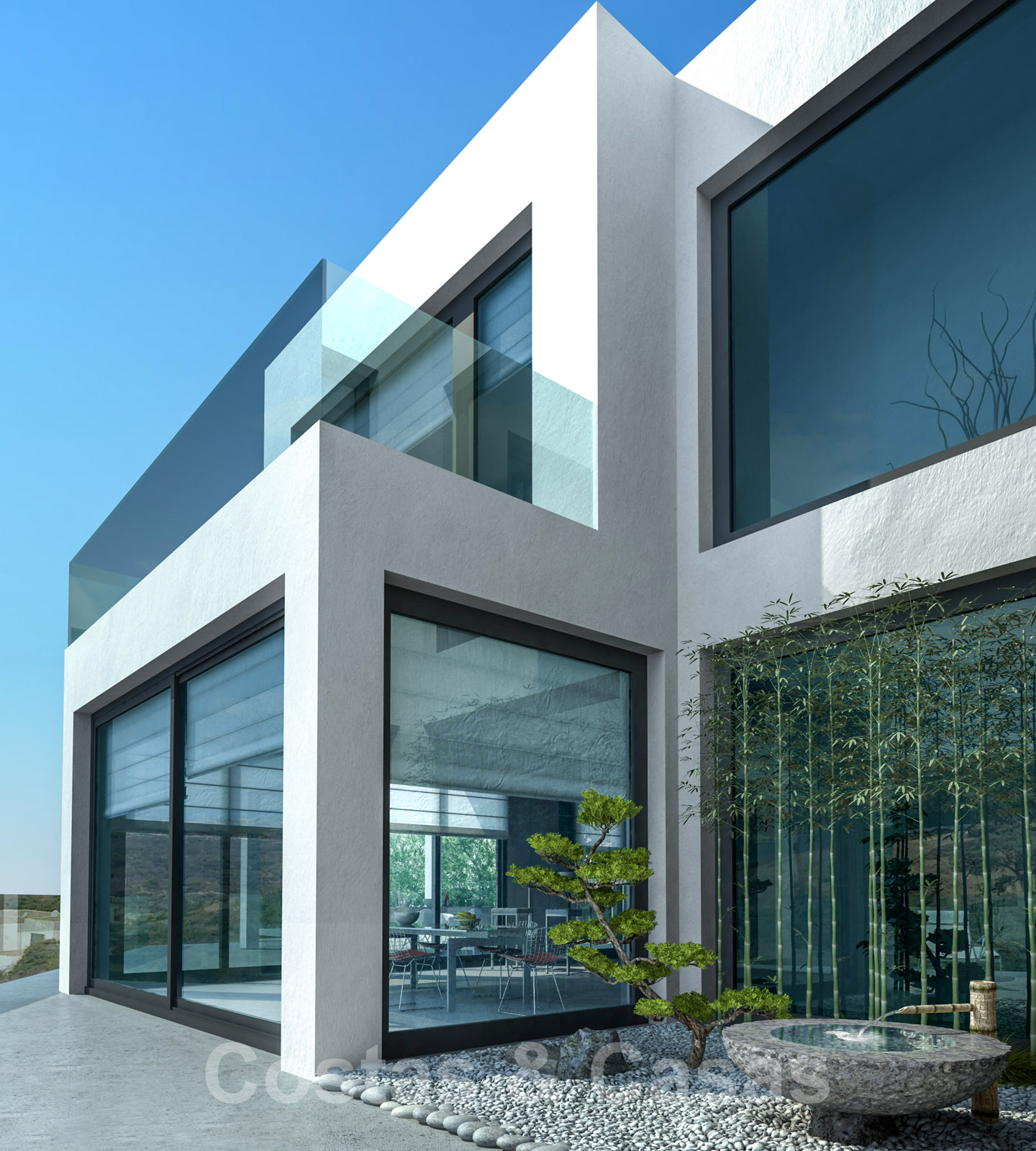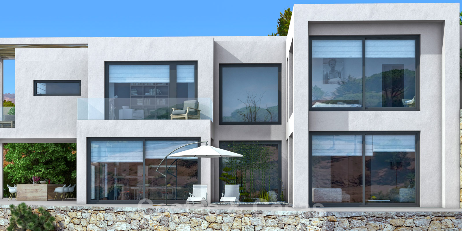 • De kamerhoge ramen en de patio´s laten het interieur baden in het licht