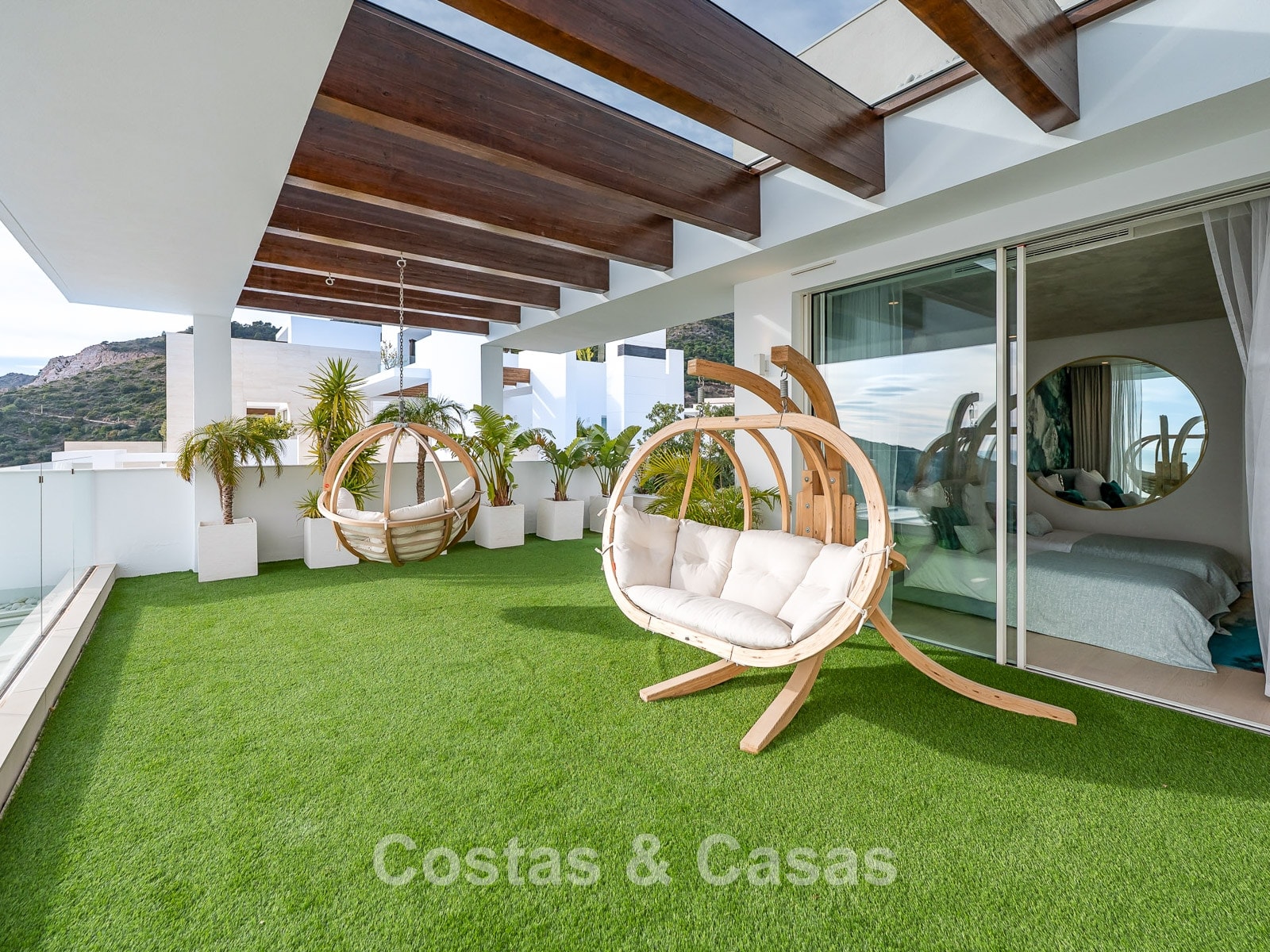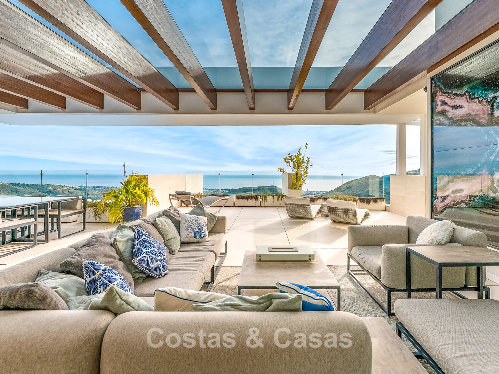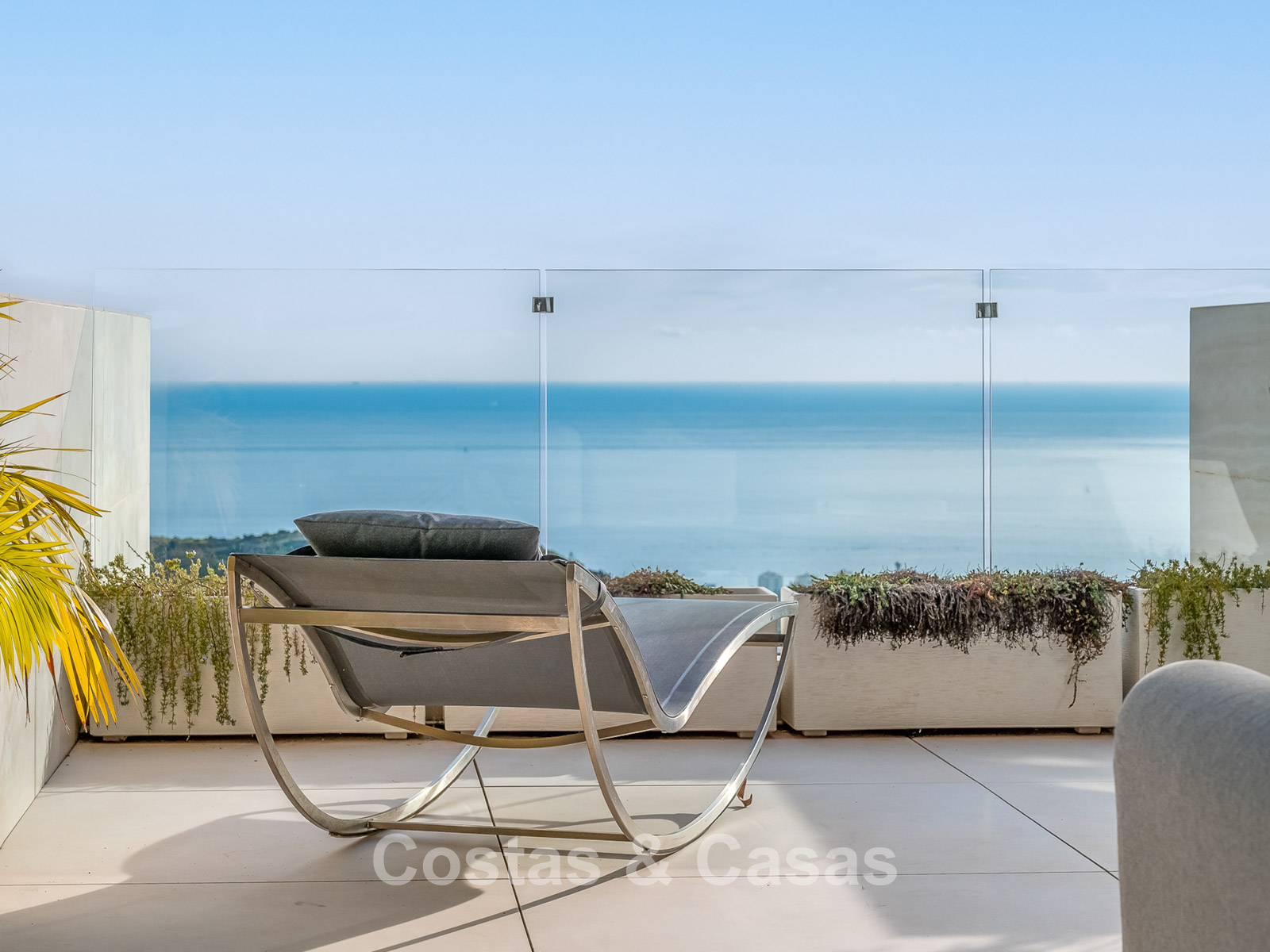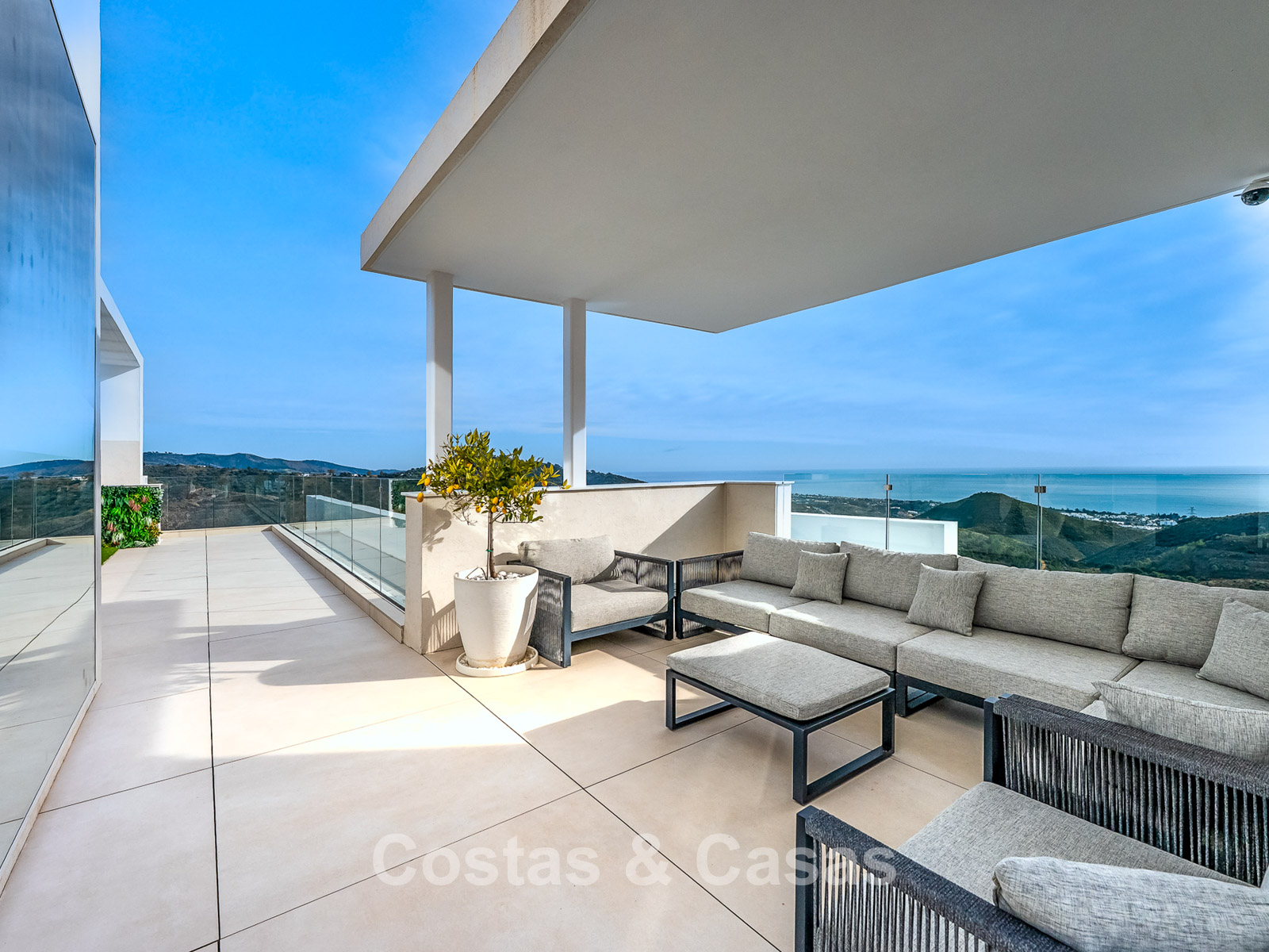 De buitenruimte is spectaculair met een “wrap-around” terras en een enorm solarium op de bovenste verdieping.