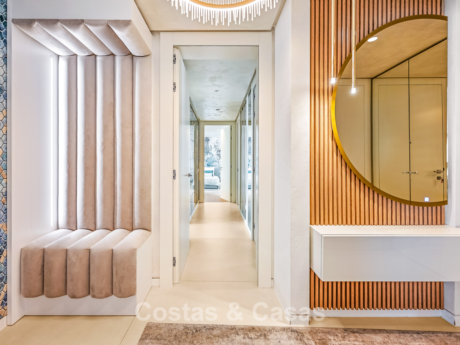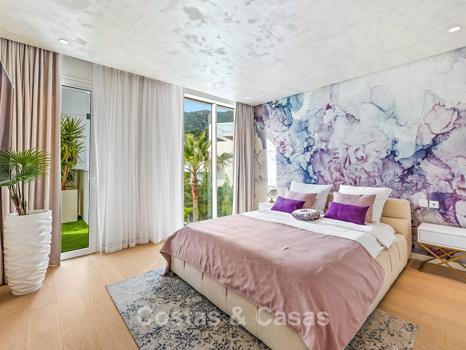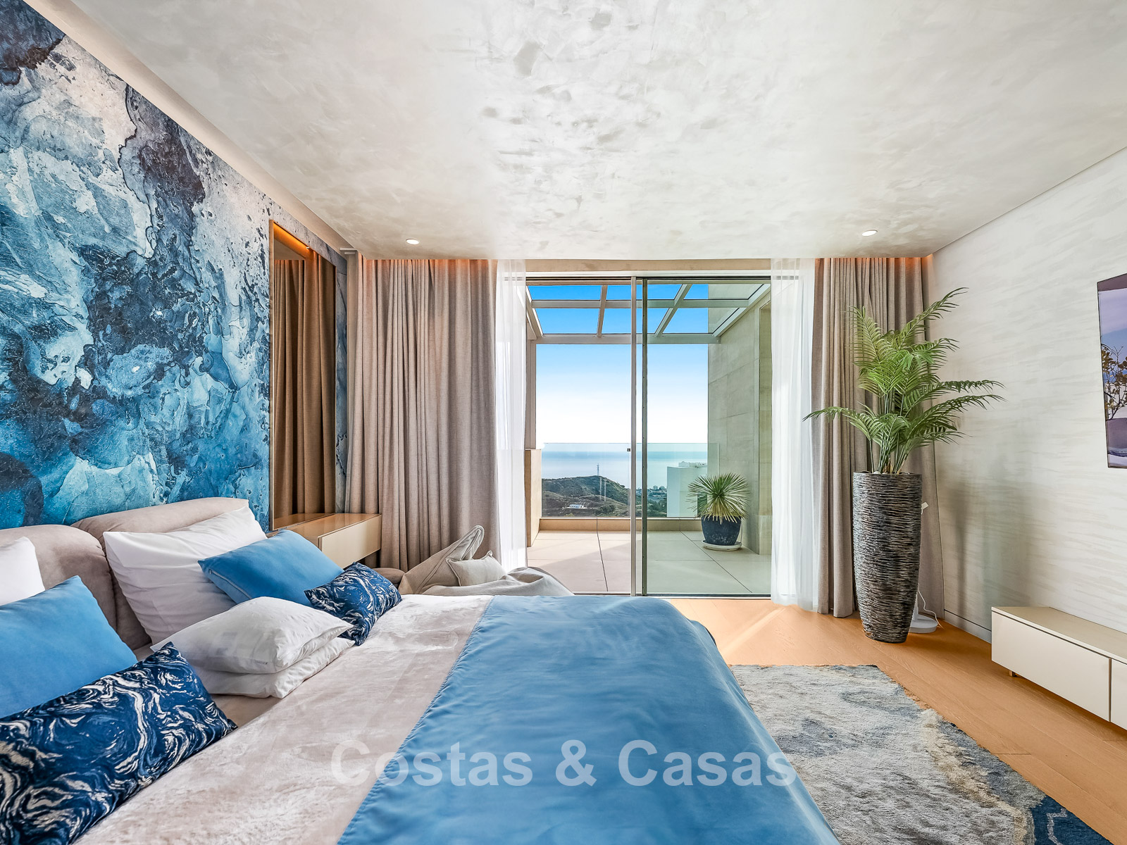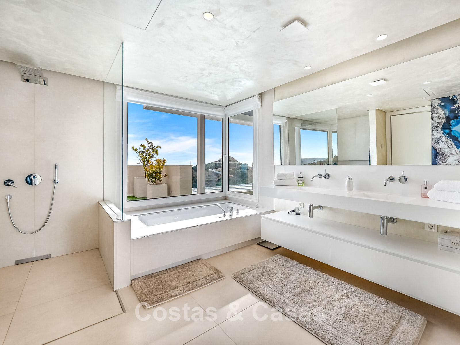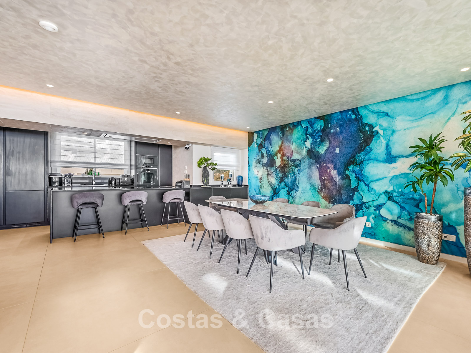 De buitenruimte is spectaculair met een “wrap-around” terras en een enorm solarium op de bovenste verdieping.