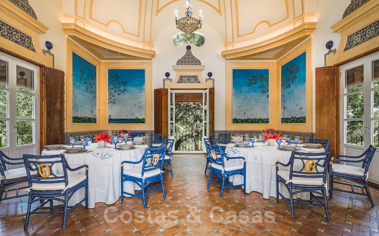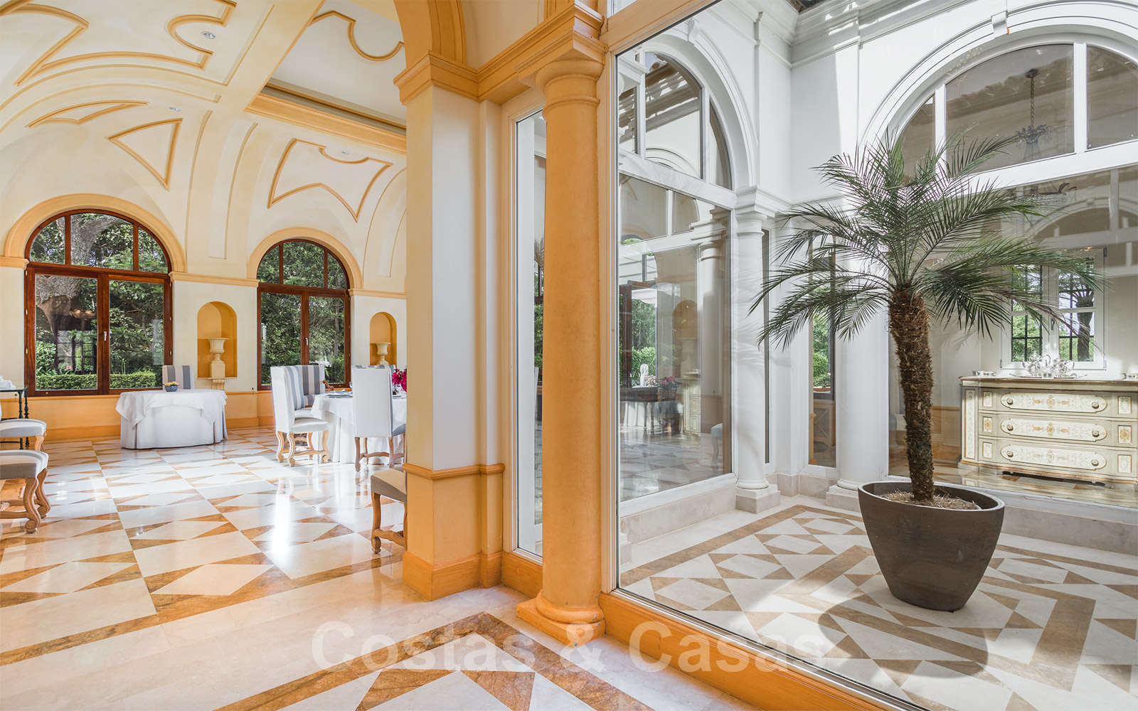 • Zowel overdekte als open terrassen te bereiken via de eetkamer, het salon en de bar.