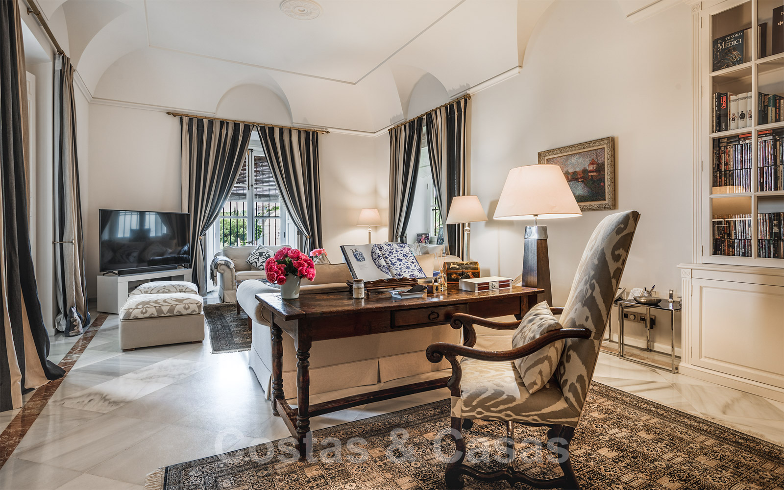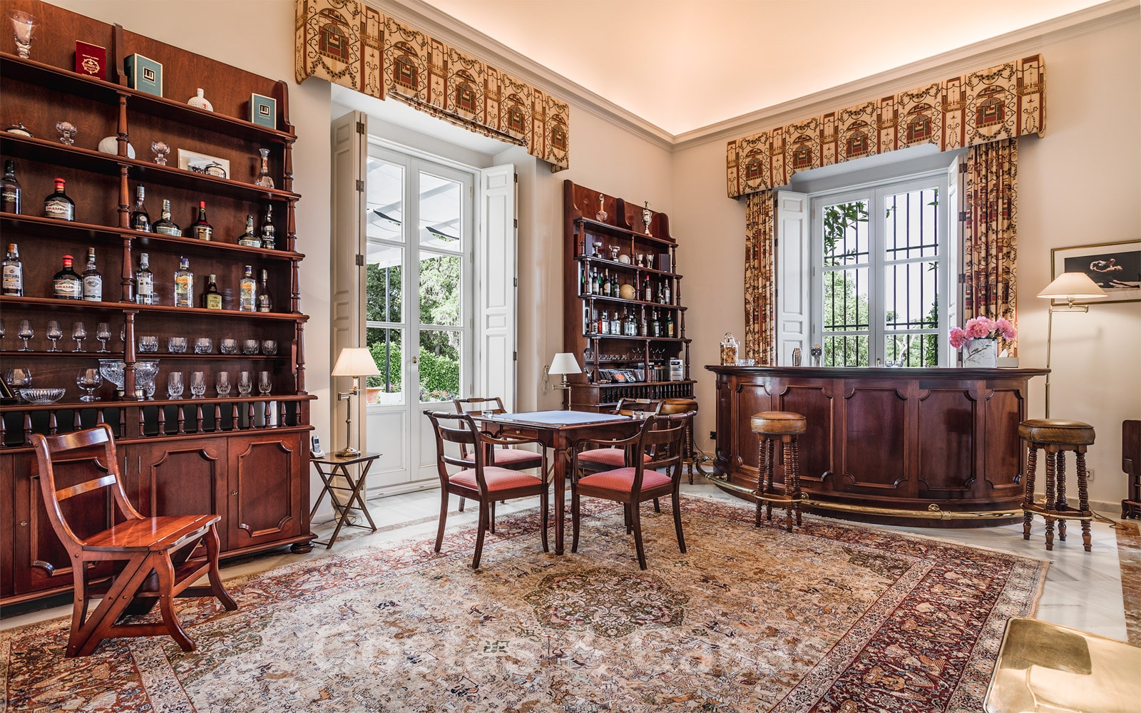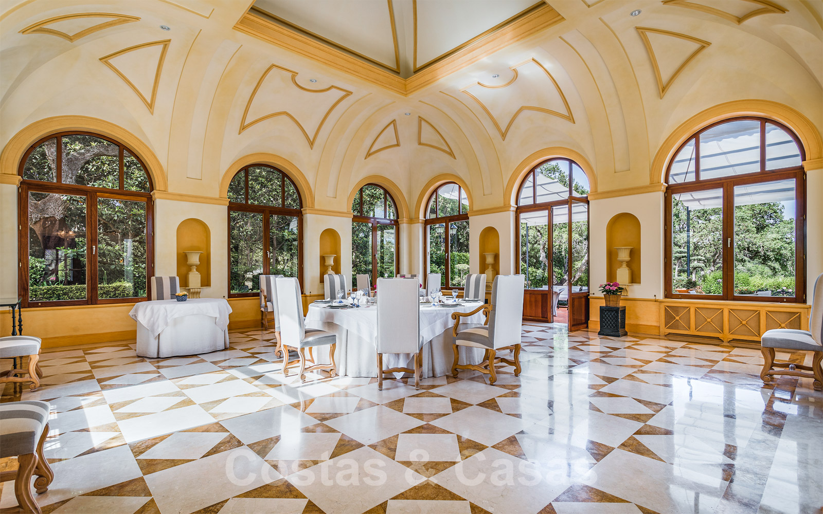 • Riante, formele eetkamer met hoog, gewelfd plafond.