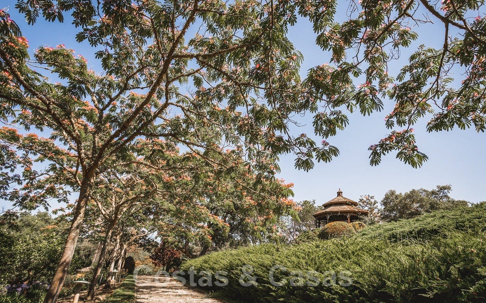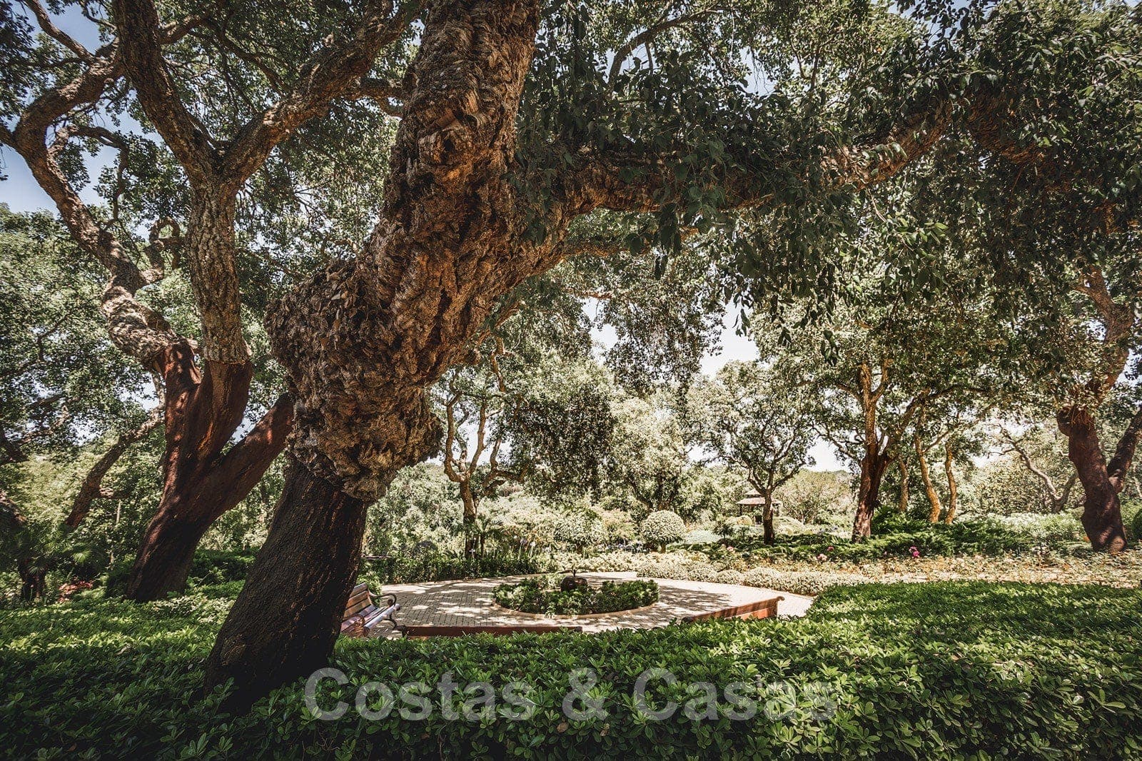 • Architecturale landschapstuin met een ruim aanbod aan verschillende soorten vegetatie, kurkeiken, boomgaard, moestuin en meerdere waterpartijtjes.