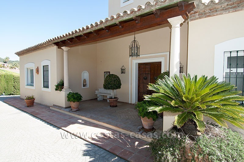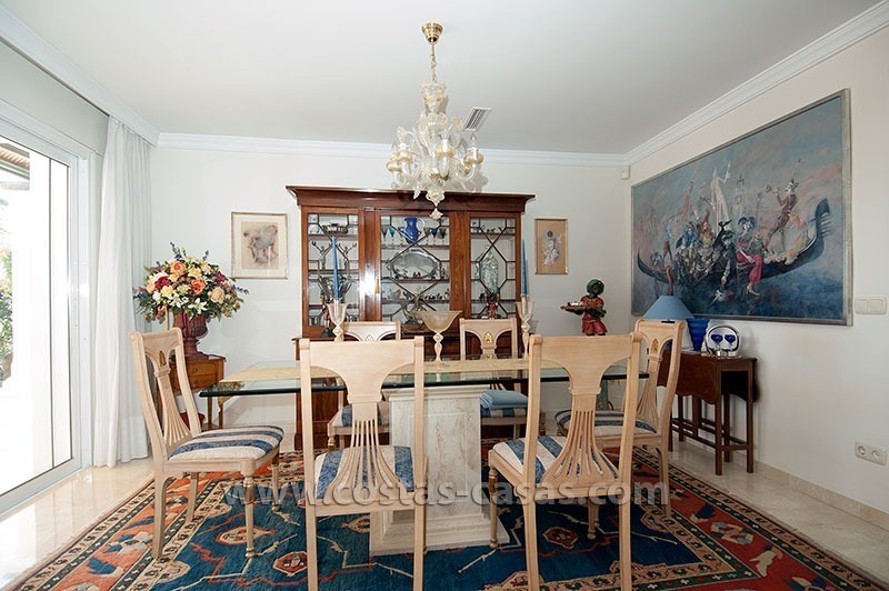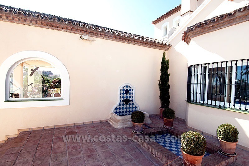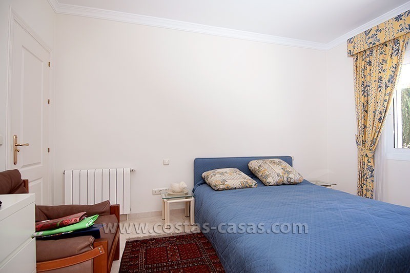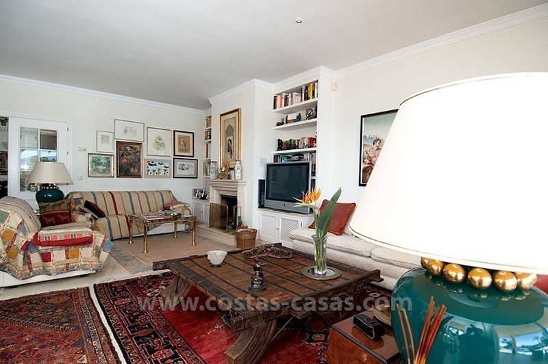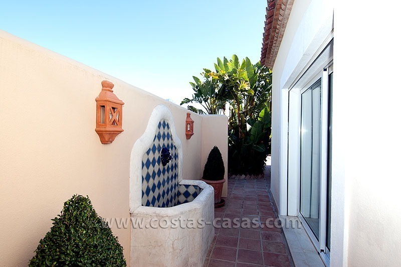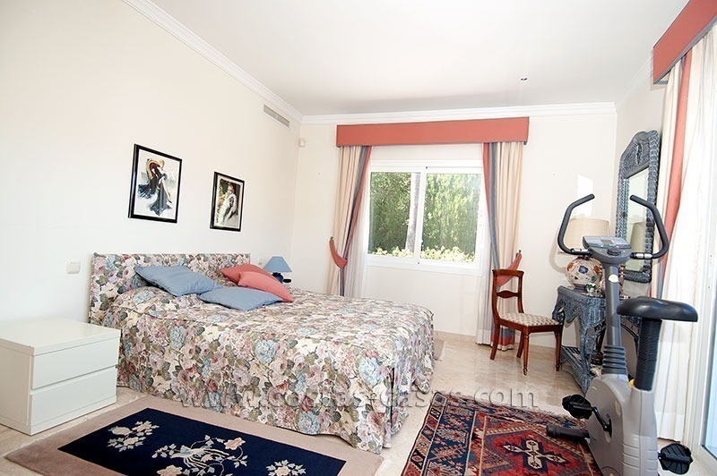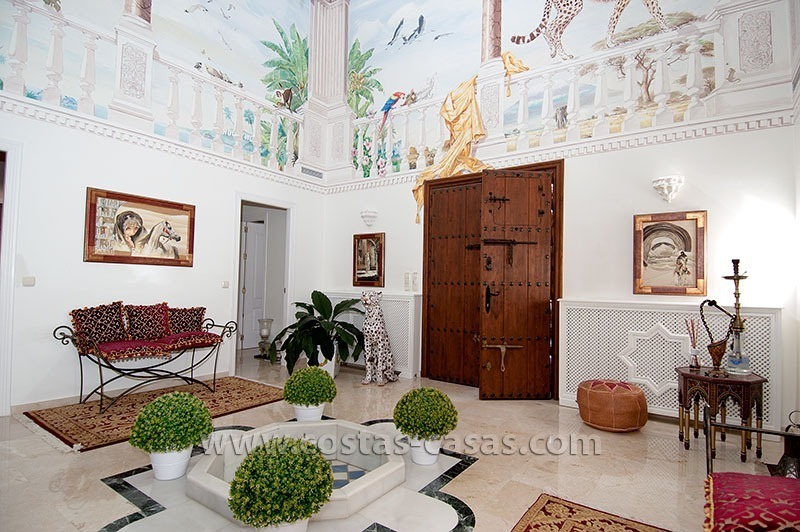 De woning is gelegen in een rustig en veilig residentieel deel van Marbella, nabij eersteklas golfbanen en een grote verscheidenheid aan winkels. Deze gelijkvloerse villa bevat drie slaapkamers, elk uitgerust met zijn eigen en-suite badkamer. De dubbelhoge ontvangsthal is uitgerust met een fontein en versierd met muurschilderingen aangebracht de door huidige eigenaar – een gerenommeerde illustrator.